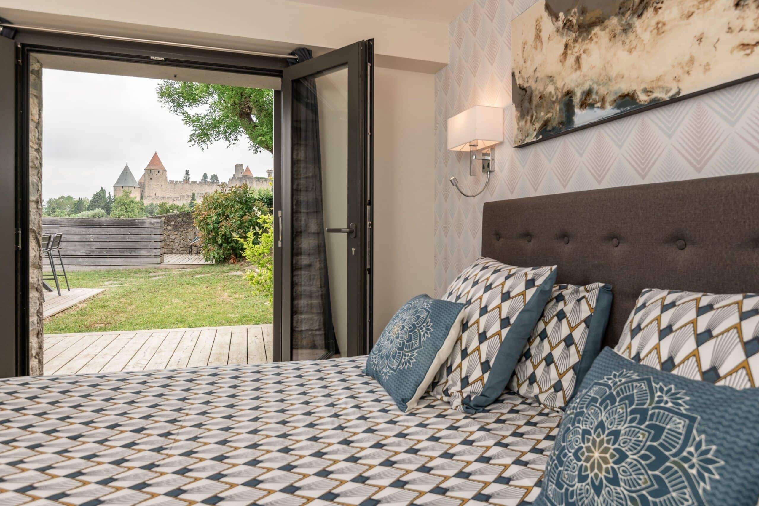 Cette belle suite offre un accès direct sur la terrasse avec vue sur les remparts de la Cité de Carcassonne. Lit king-size fixe. Climatisation. Salle d’eau privative avec meuble vasque et douche italienne.