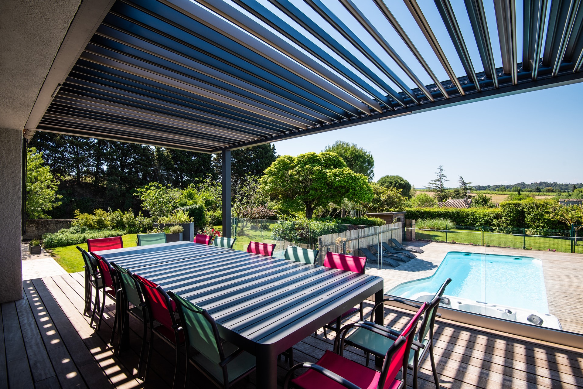 Accès direct depuis la pièce de vie, cette grande terrasse domine le parc et la piscine, avec en arrière-plan les vignes, la nature et les Pyrénées. Grâce à sa pergola bioclimatique, elle se savoure en toutes saisons, du petit-déjeuner au dîner sous les étoiles.